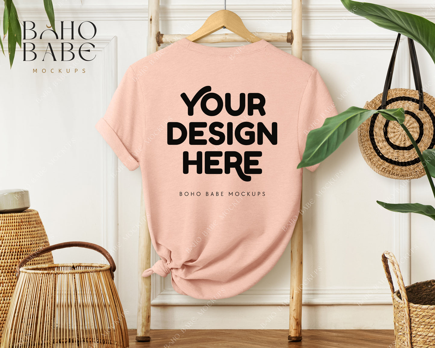 Bella Canvas 3001 HEATHER PEACH Hanging Back of T-shirt Mockup | Boho Babe Mockup Design