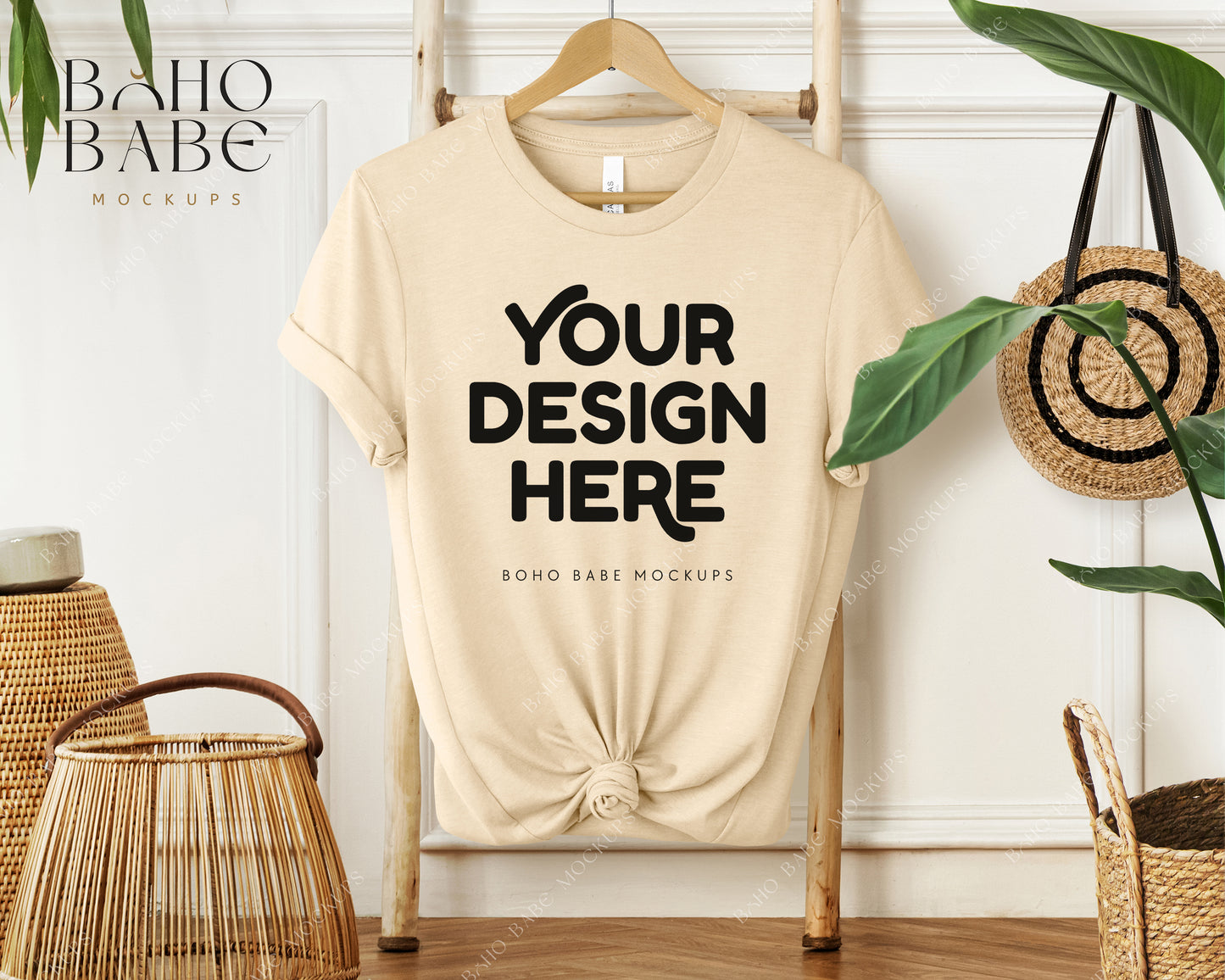 Bella Canvas 3001 HEATHER SOFT CREAM Hanging T-shirt Mockup | Boho Babe Mockup Design
