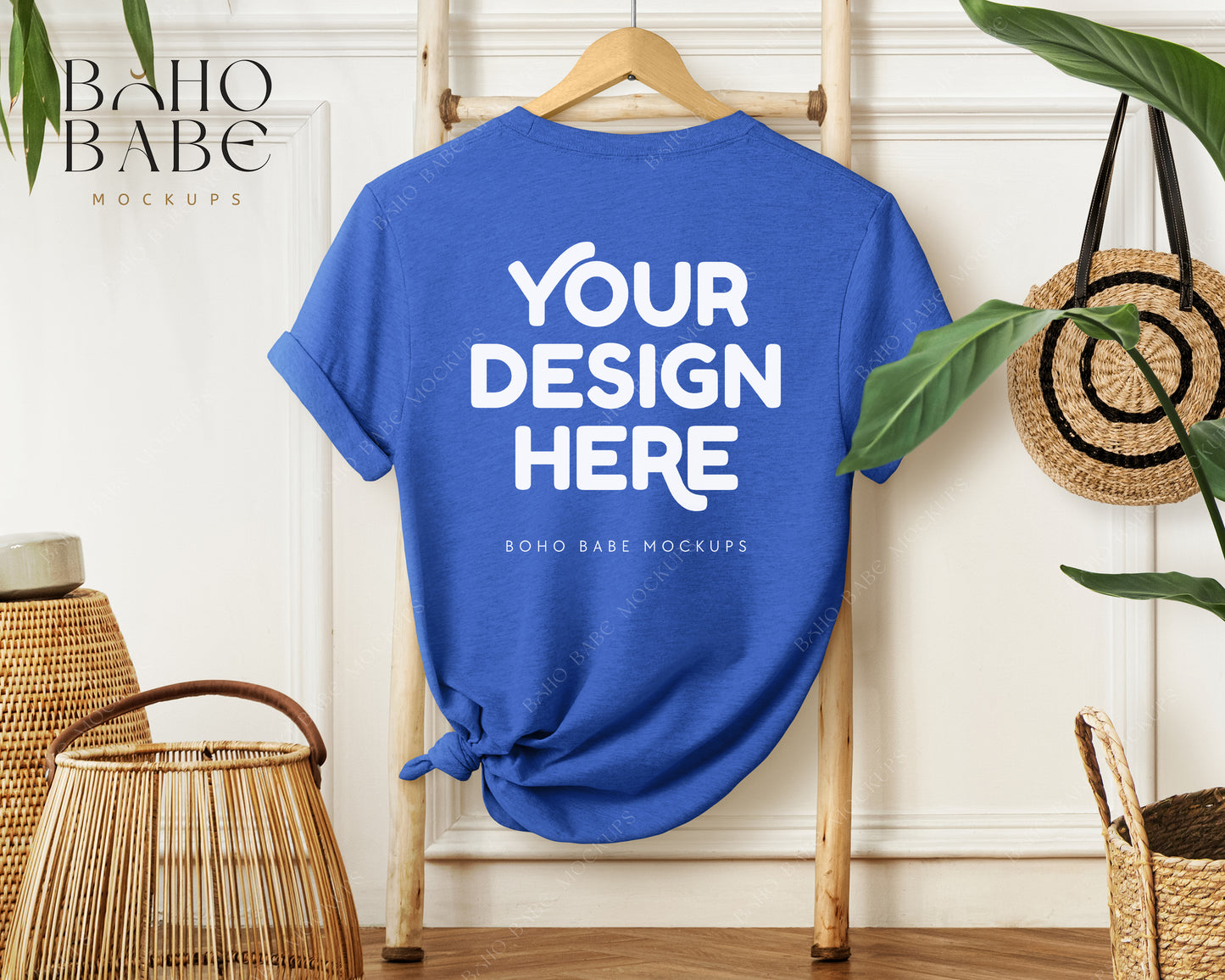 Bella Canvas 3001 HEATHER TRUE ROYAL Hanging Back of T-shirt Mockup | Boho Babe Mockup Design