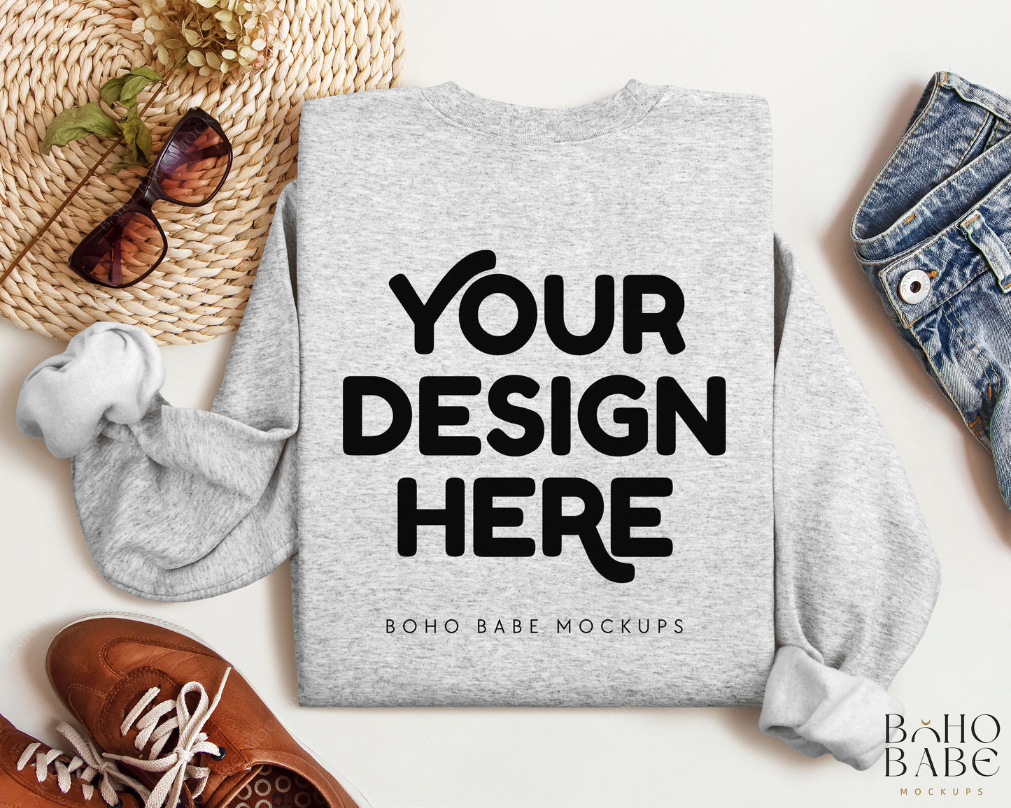 Gildan 18000 ASH Back of Sweatshirt Mockup | Boho Babe Folded Mockup Design Vol.2