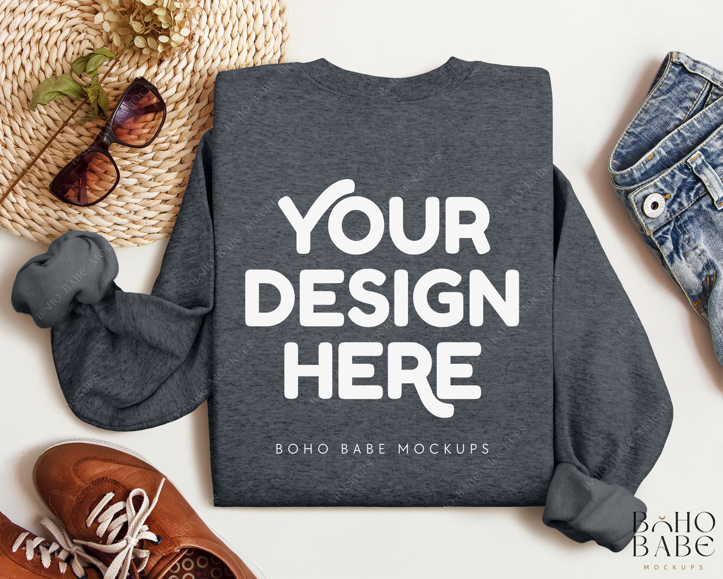 Gildan 18000 DARK HEATHER Back of Sweatshirt Folded Mockup | Boho Babe Mockup Design