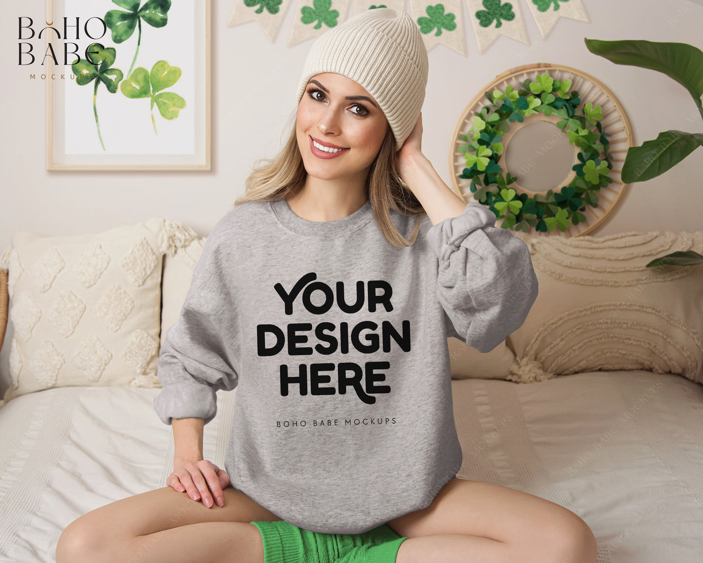Gildan 18000 SPORT GREY St. Patricks Day Model Mockup | Boho Design