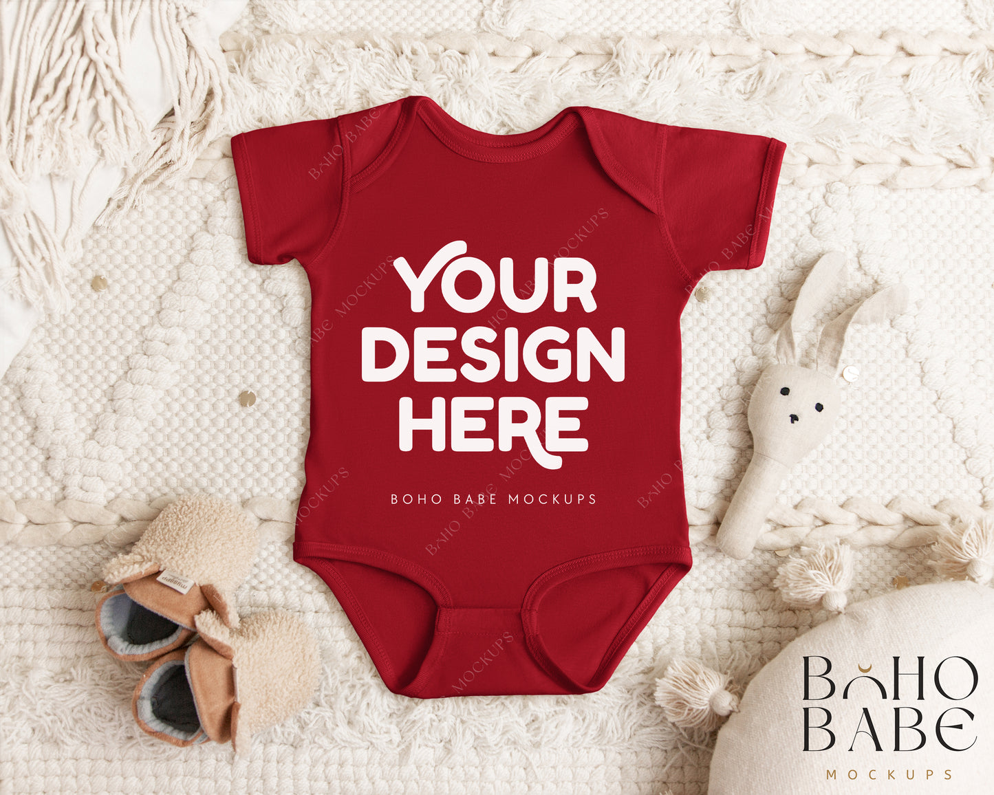 Rabbit Skins 4424 GARNET Short Sleeve Onesie Mockup | Boho Babe Flatlay Mockup Design