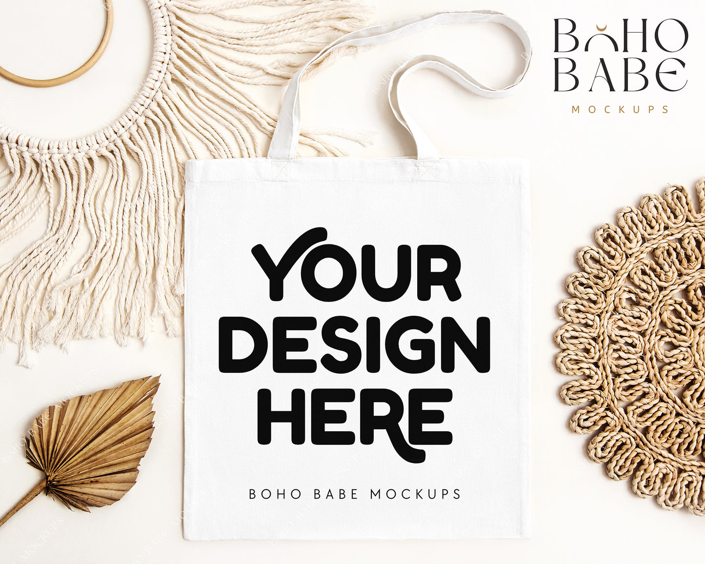 Tote Bag WHITE Mockup | Boho Babe Flatlay Mockup Design